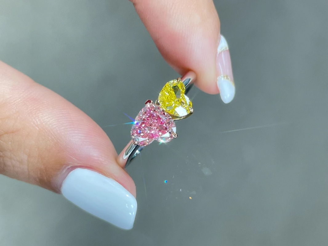 実験室で栽培されたピンク&イエロー 合成ダイヤモンドリング 高級宝石 18k 白金